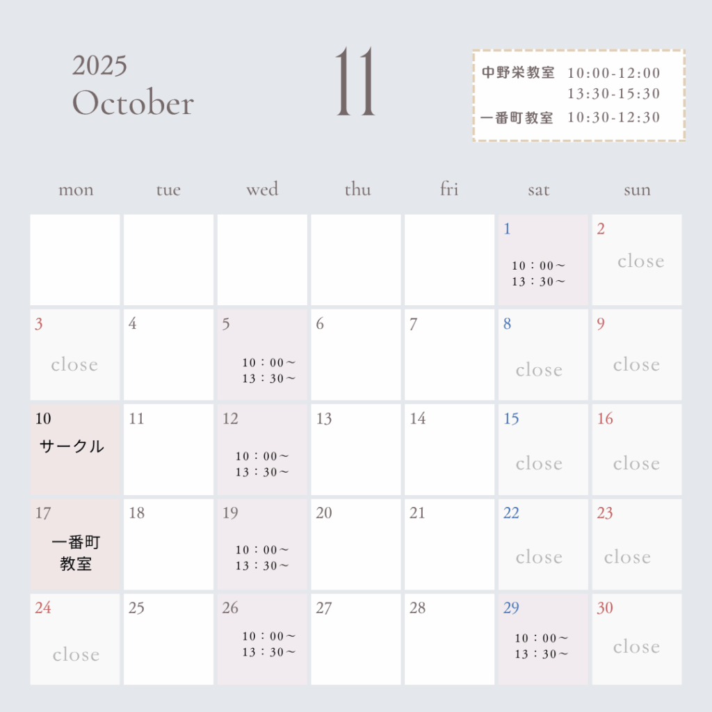 - 12月のレッスンについて一番町教室 12月1日(月)10時30分~12時30分 12月15日(月)10時30分~12時30分 ✼••┈┈一番町教室┈┈••✼ 場 所:サンモール一番町『ボタンのムツミヤ』さま 3Fカルチャースペース […]